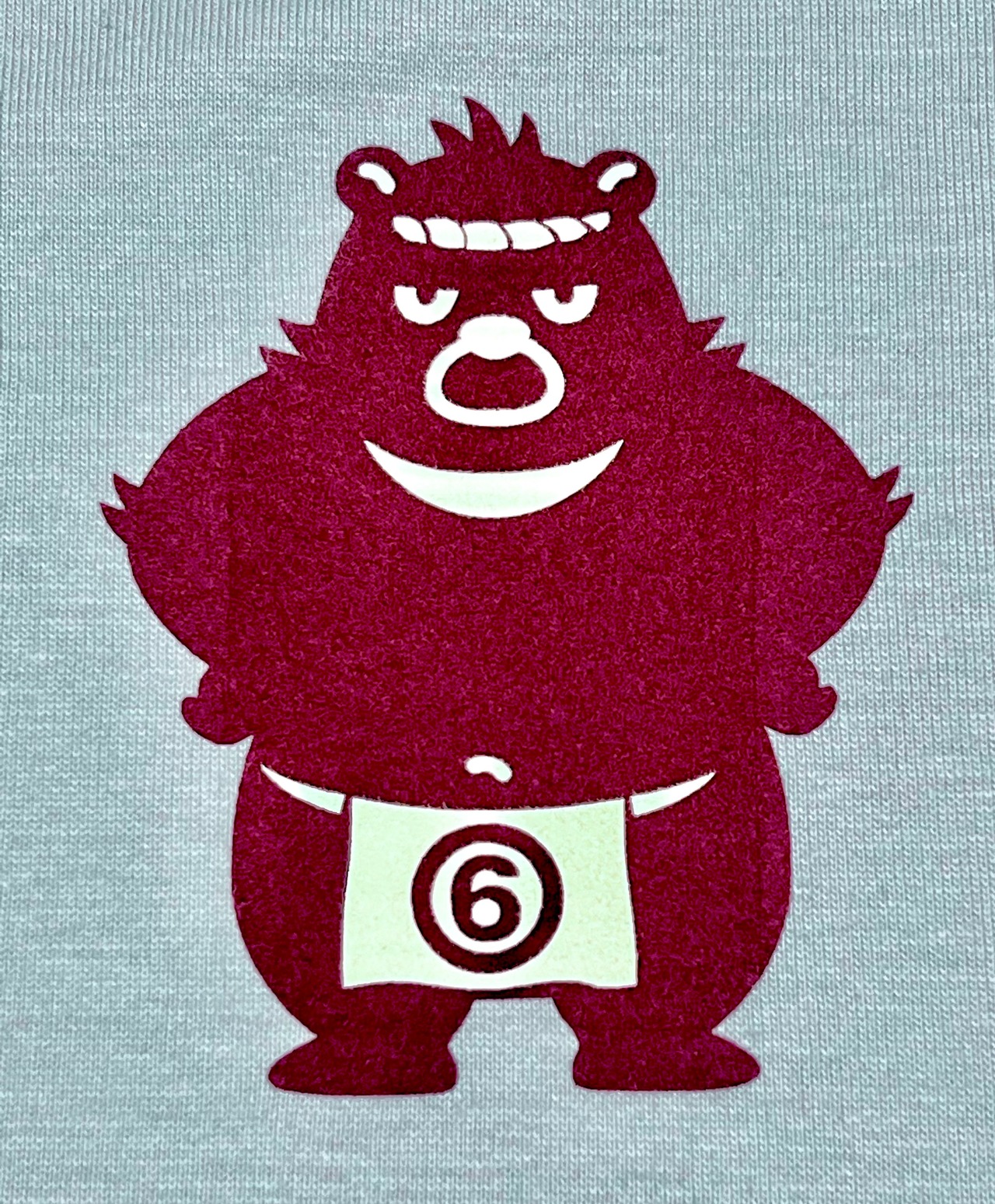 涼やかなライトブルーにバーガンディ、すなわりワイン色の熊六さんがフロッキープリントされた、キャッチーながらも少し大人感のあるコントラストのTシャツです